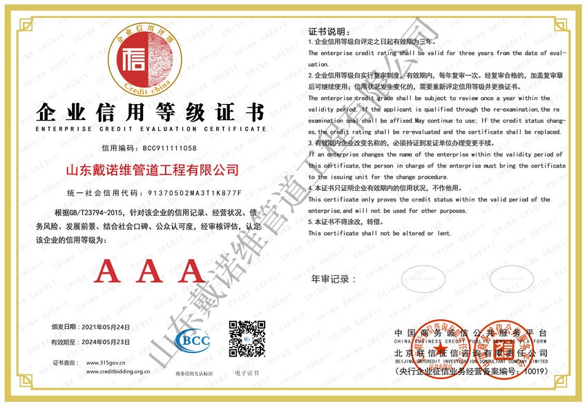 管道非開挖修復工程服務企業資質證書