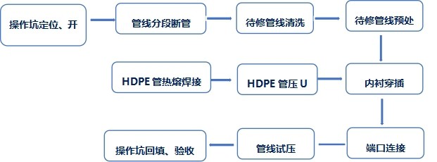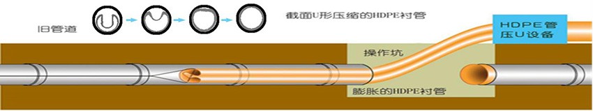 管道內襯PE管修復是將外徑等于或略小于待修復管道內徑的HDPE襯管,通過專用壓U設備,截面被壓變成雙層U形。在牽引力的作用下穿入待修復管道內部。穿插到位后,利用壓力打開管腔,使之恢復成圓形,與外管道內壁貼合,形成牢靠的復合管。